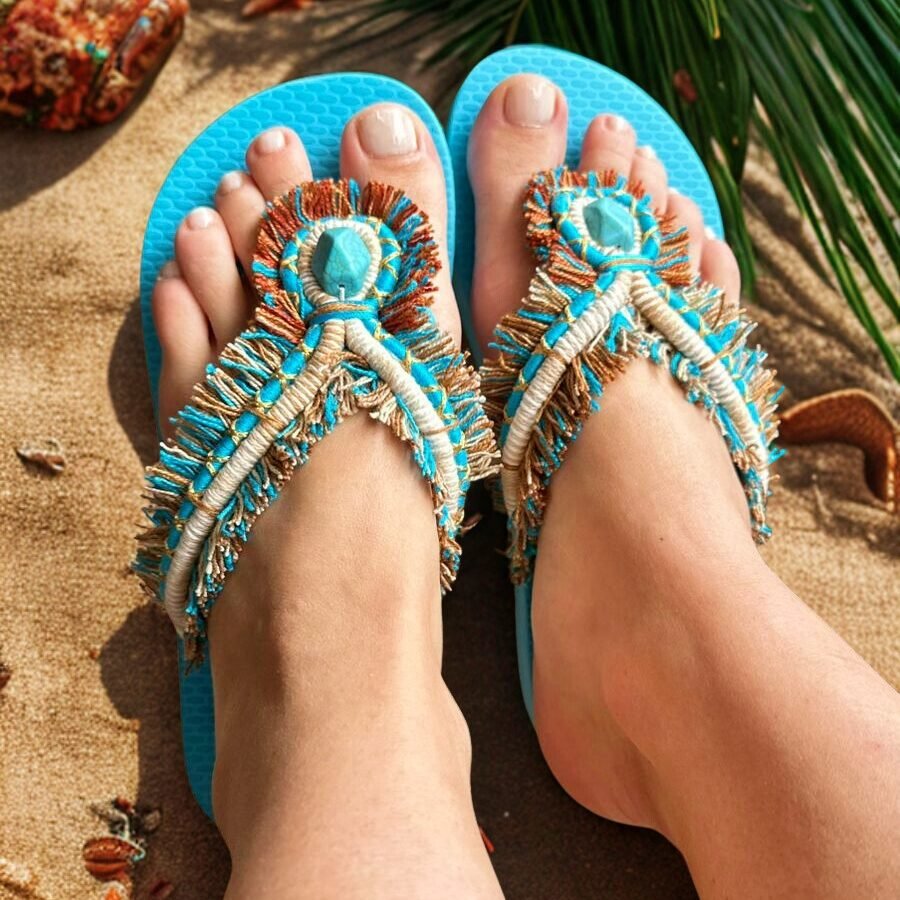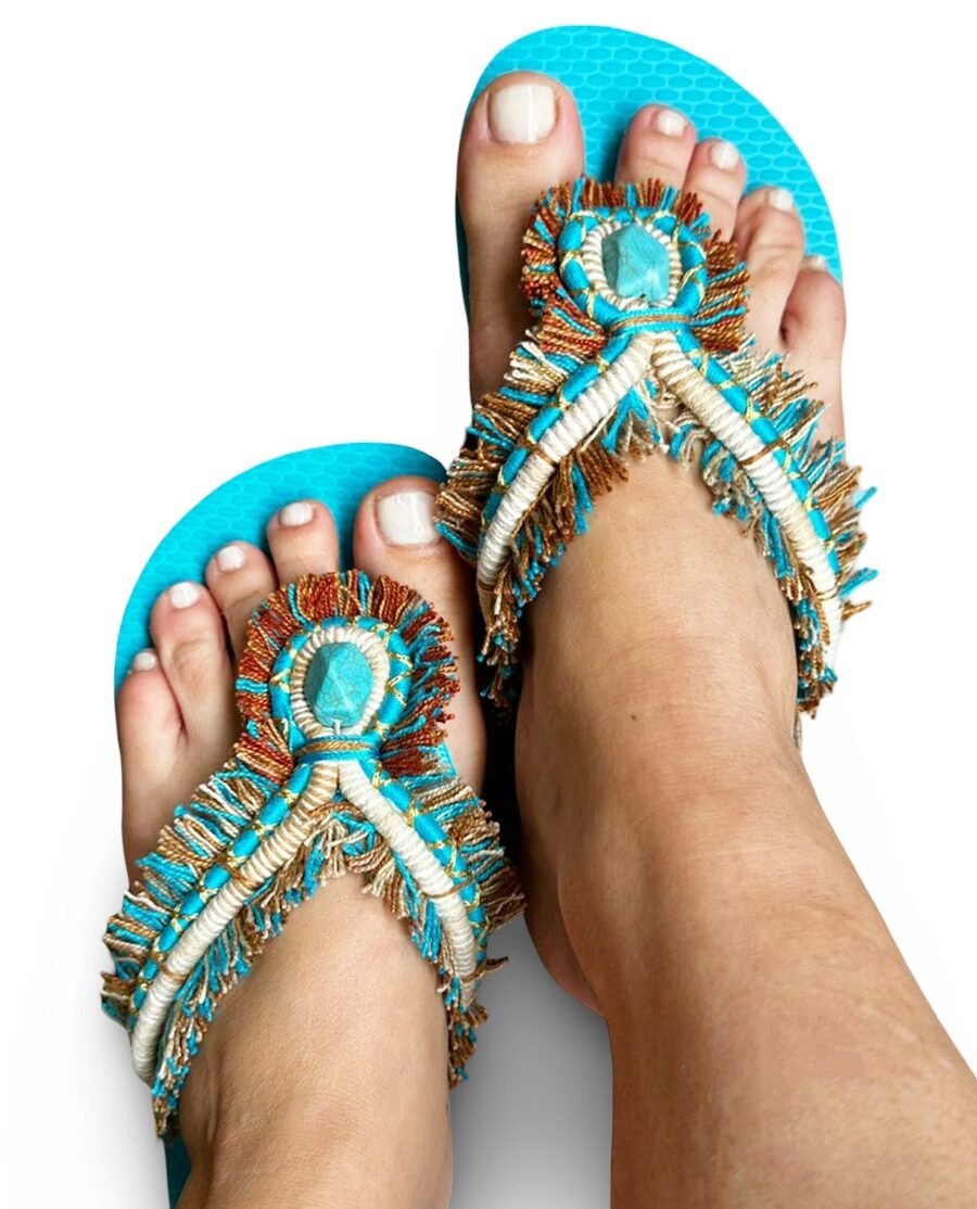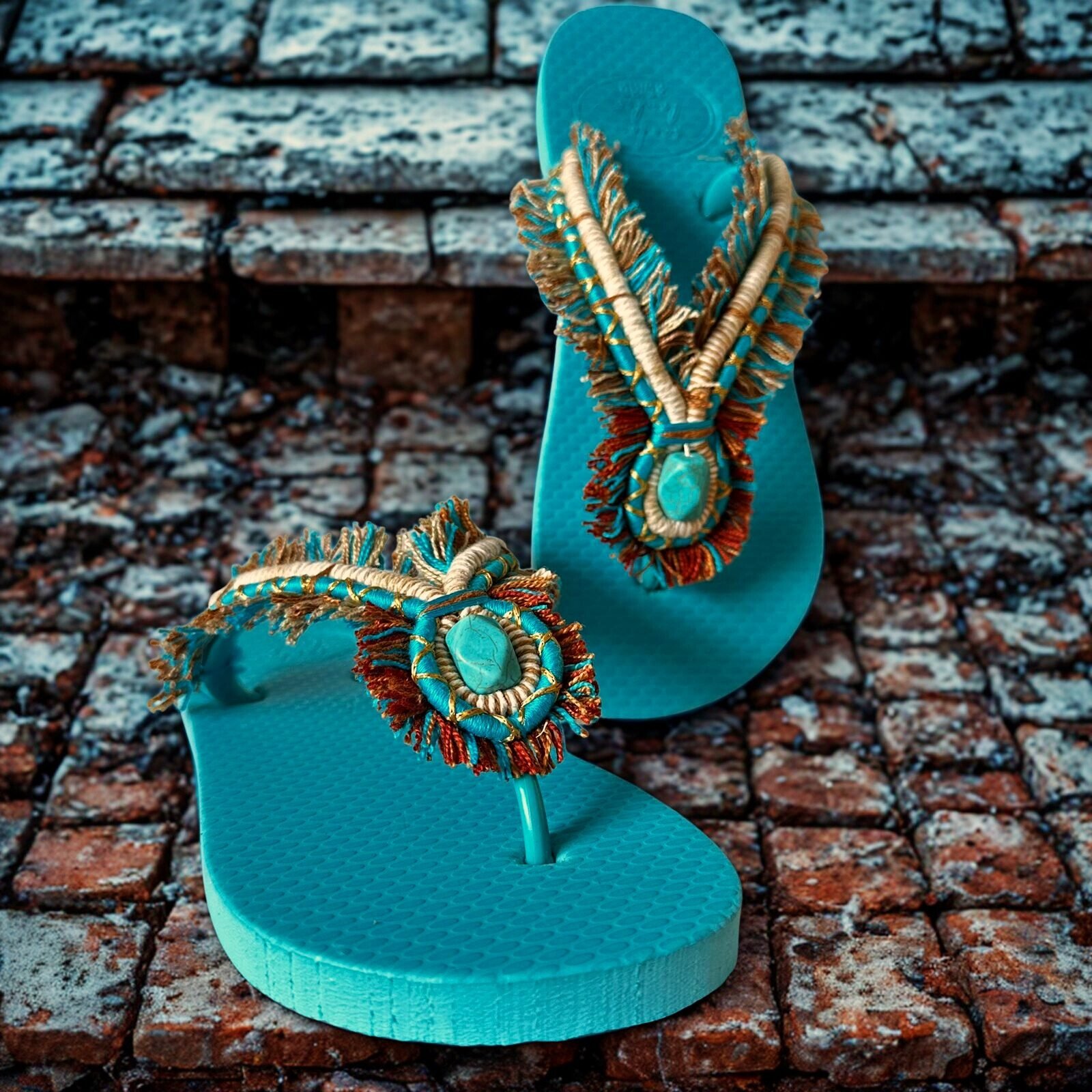 Este chinelo azul turquesa no tradicional modelo em Y, ganha vida com franjas e traz como destaque uma pedra Turquesa.