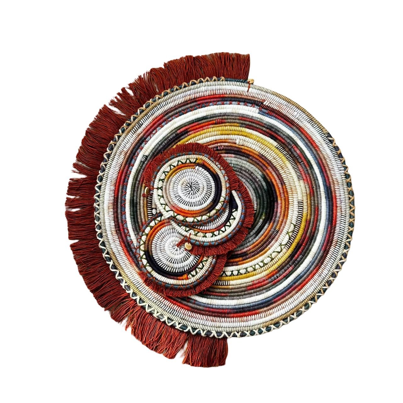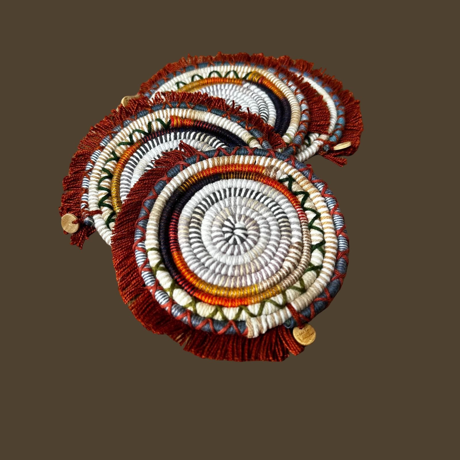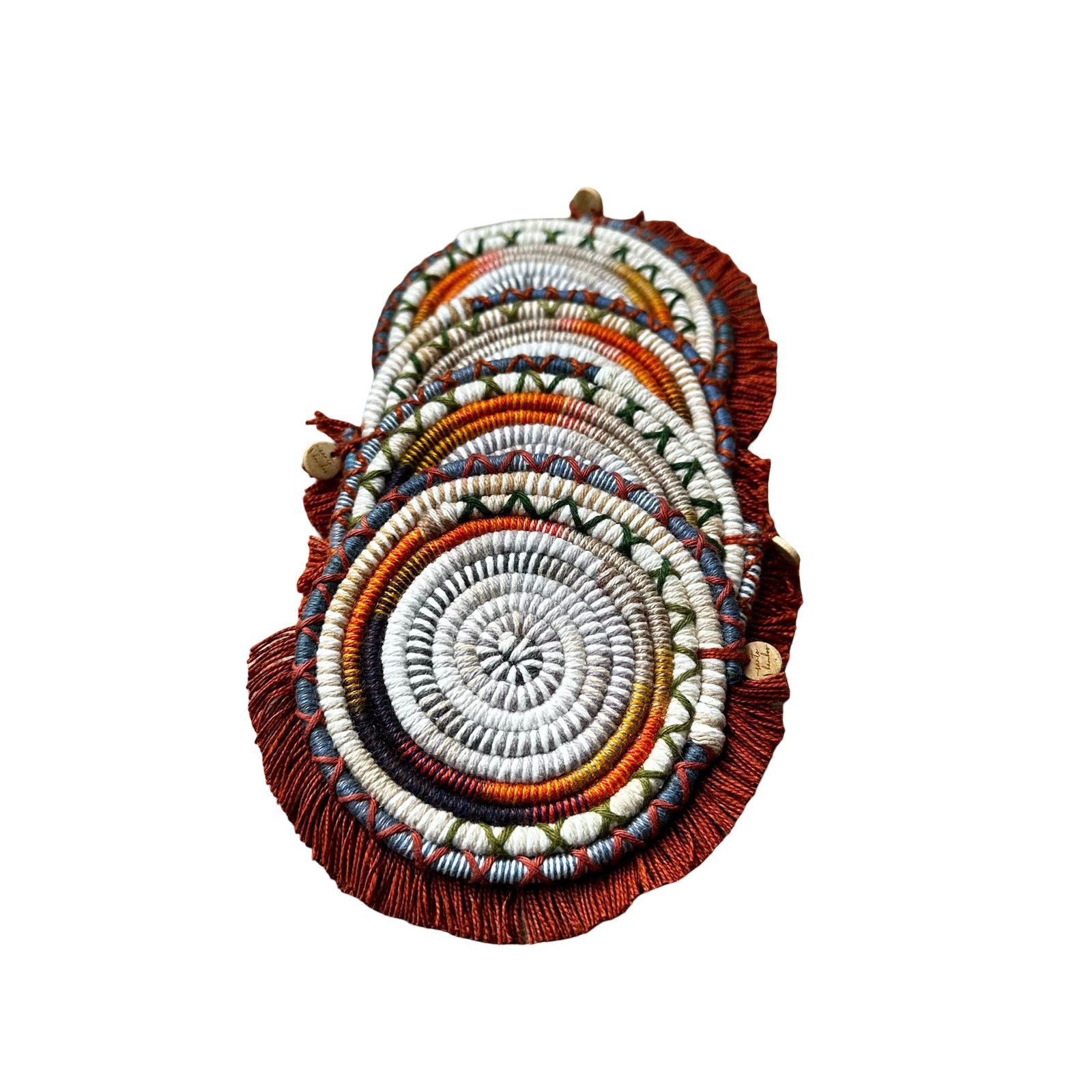Conjunto artesanal de  4 porta copos feitos à mão com cordinhas artesanais em algodão, moldados em formas circulares que acolhem com suavidade qualquer recipiente.